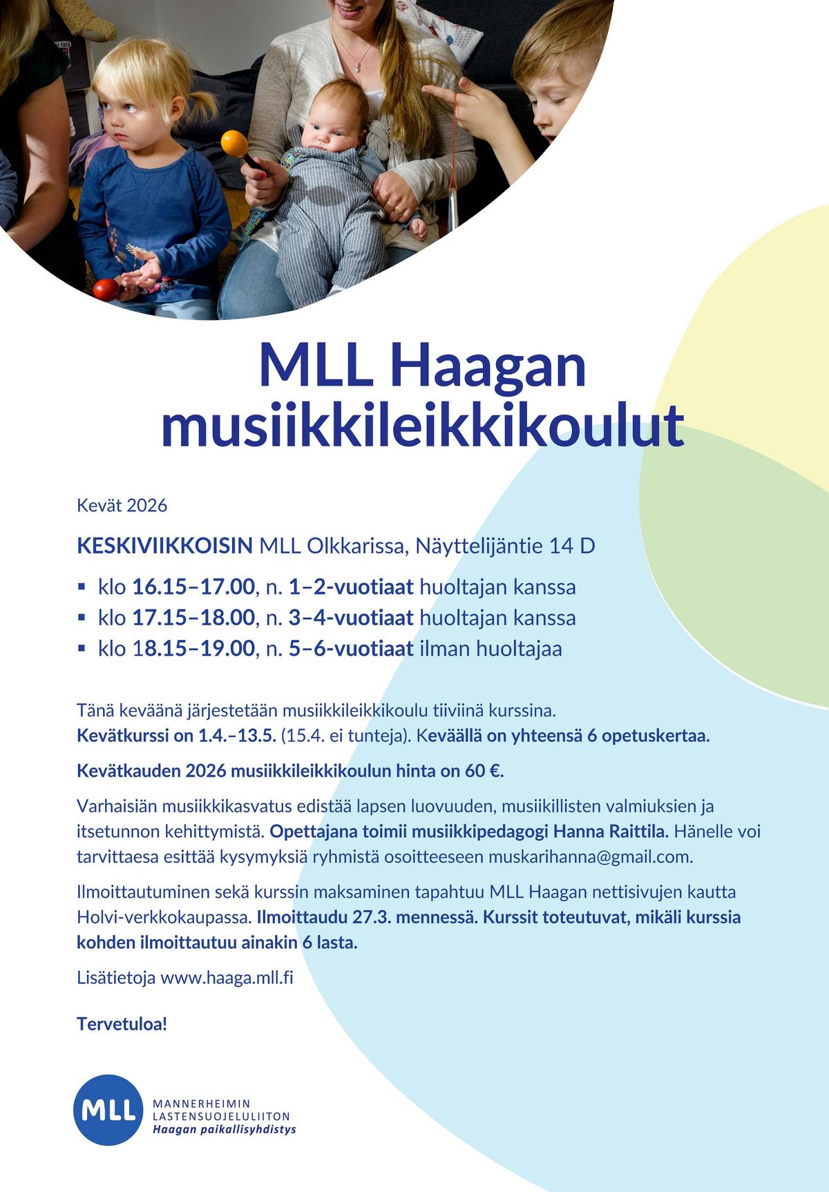 Kevätkauden 2026 musiikkileikkikoulun hinta on kaikille 60 € (MLL Haagan jäsenhintaa tai sisarusalennusta ei ole erikseen tälle kurssille.)