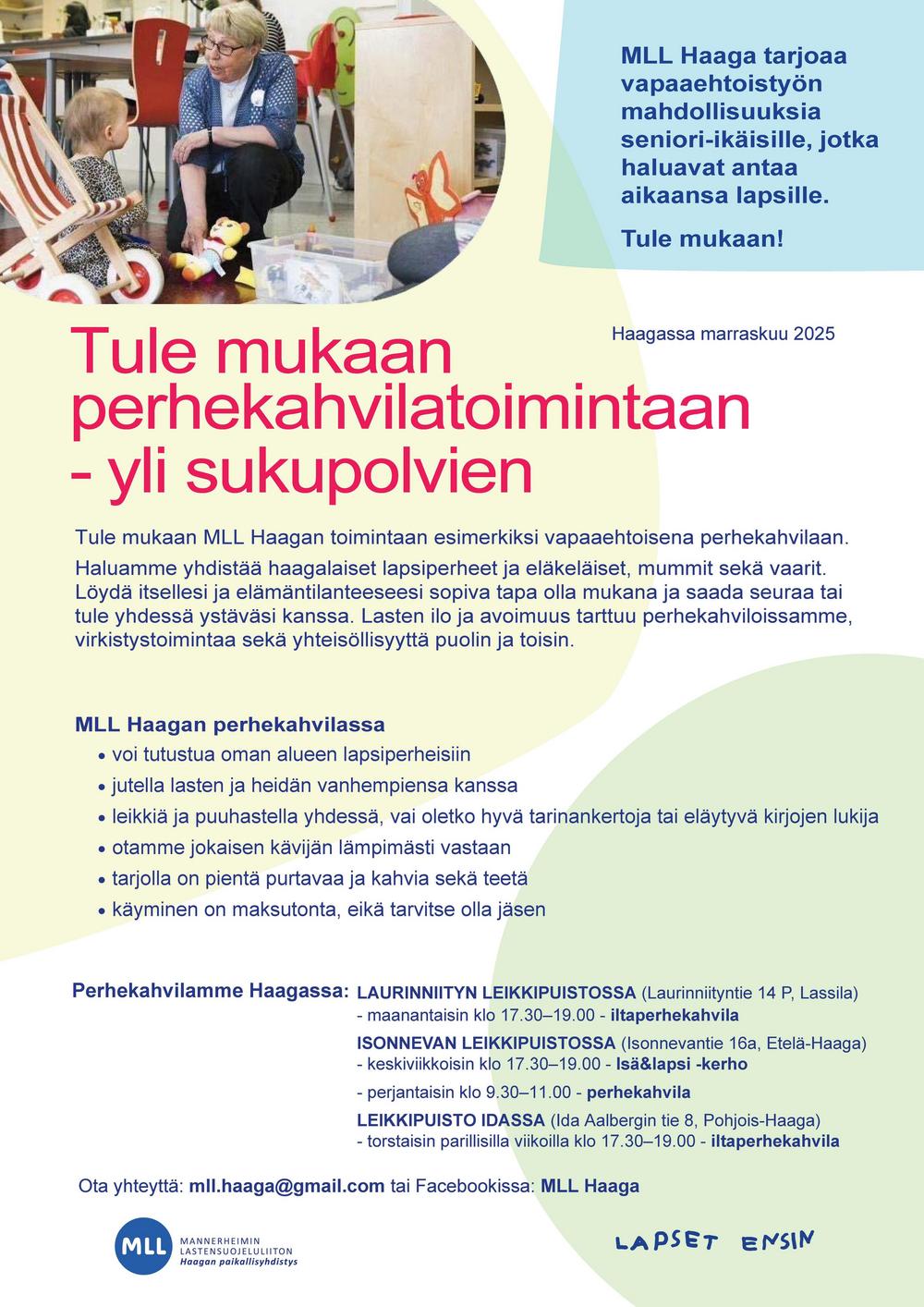 Kahvilat ja kerho pyörivät vapaaehtoisvoimin. Perhekahvilan ohjaajana toimii vapaaehtoinen tai vapaaehtoisista koostuva perhekahvilatiimi. Haluaisitko sinä antaa aikaasi ja tulla mukaan vapaaehtoiseksi ohjaajaksi, joko yksin tai yhdessä lapsesi tai ystäväsi kanssa? Jos kiinnostuit lähtemään mukaan vapaaehtoiseksi, otathan yhteyttä Facebookin kautta tai sähköpostilla mll.haaga@gmail.com.